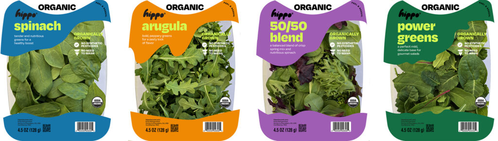 Hippo Harvest’s new organic product line includes a variety of leafy greens, such as Baby Spinach, Arugula, Baby Kale, Baby Romaine, and Power Greens, among others.